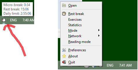 there is a small box showing time to next mini break, long break and end of work day, but there is no way to open the preferences dialog and change those settings. i've tried installing both the compact and full versions, but neither allows the preference dialog to open. i'm on windows 10 enterprise.