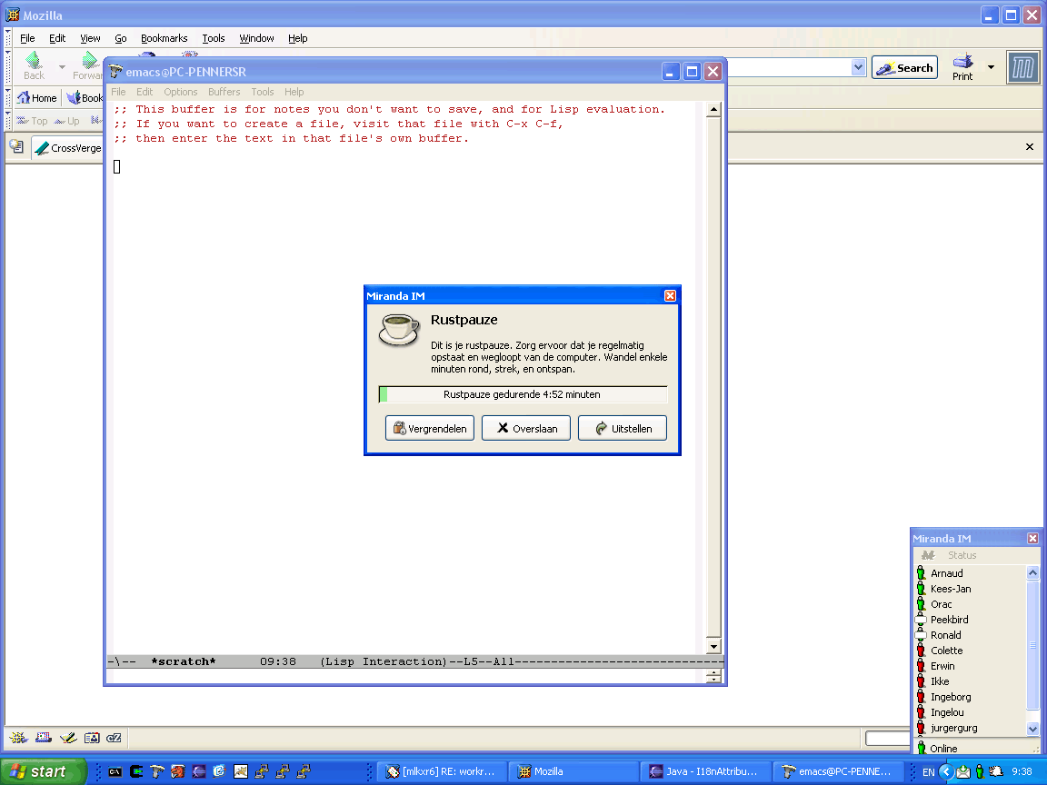 First observations: - Break windows have a close button. I recommend against that (see earlier comment) - Break windows do not have a minimize button. I'd like to have one :-) (see earlier comment) - Windows apparently are resizable (cursor changes to arrow thingies above border, and such) but can't be resized. - When the exercise window is replaced by a simple break window, the break window is placed center-screen, instead of at the location of the exercise window. - When block user input is "off" and being active during a restbreak, the break window goes away (maybe I should reopen bug 294? - When postpone and skip are turned of, wr crashes when showing the break window (see attached log)