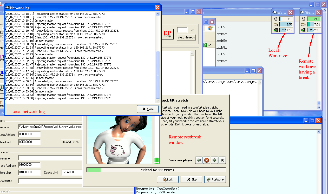 Testcase: One laptop running workrave. One test-pc also running workrave. The two are connected via the network. The laptop also has a VNC connection to the test pc. Use the VNC connection to control the test-pc remotely Expected result: Workraves should remain in sync, prompting for breaks simultaneously Actual result: Workraves get out of sync: The test-pc presents a restbreak long before the laptop does. Found in 1.8.4-rc1 See also attached partial screenshot, with annotations