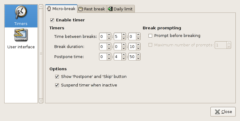 (In reply to comment #1) > That sounds like a bug or something to do with the break duration. Did you > change any other settings? If you have the timer set to 5 min and your break > duration is like 5 seconds that won't work, because then the timer will reset > after 5 seconds of inactivity. > > You can also try disabling "Suspend timer when inactive" > > Would you mind taking a screenshot of your Micro-Break preferences? Please > attach it in your reply. > I do have my micro break duration at 10 seconds, so maybe that's why the timer resets itself, because workrave thinks the 10 seconds of inactivity is equivalent to a micro break. However, this is the wrong behavior. Even though my keyboard and mouse are inactive, I am still staring at the screen for the ten seconds. That's not much of a break if vision is considered in addition to RSI.
