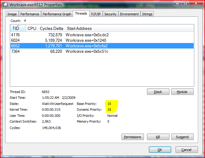 Created attachment 173 workrave thread list Please download Process Explorer. It is digitally signed by Microsoft. http://technet.microsoft.com/en-us/sysinternals/bb896653.aspx Access the Workrave process and kill the thread with priority 15 (see screenshot). After you do that check the real-time statistics in Workrave. Move the mouse, press some keys, etc. The statistics should no longer change. Please re-run your tests after doing that. Thanks, Ray