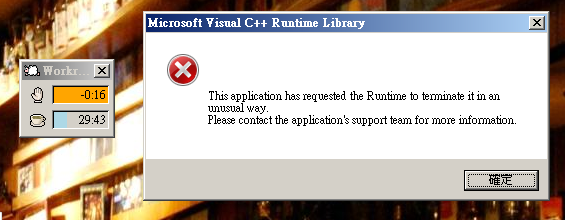 Created attachment 207 error message The problem started to occur from 2 to 3 weeks ago. Everytime when the micro break occurs, error message will pop out saying: "This application has requested the Runtime to terminate it in an unusual way. Please contact application's support team for more information". Then Workrave will terminate. No error log is generated.